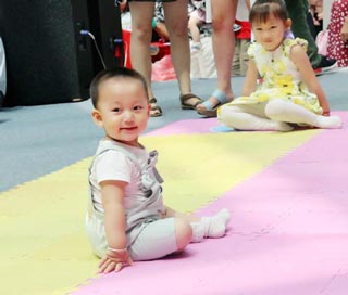 当天上午,20多个萌宝从苏州四面八方赶到万达复赛现场,他们都是些不到18个月的小不点,不过他们都是从众多小不点中胜出的小宝宝们。爬行比赛分为四个赛道,赛道5米长,小选手们在爸爸妈妈的鼓励下一路向前。