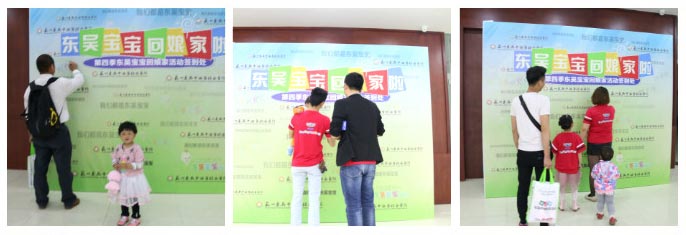 (她们认真的在签到幕上签上自己和孩子的名字)