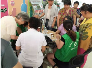 8月02日,东吴医疗义工队走进金阊街道虹桥社区,为这里的居民提供义诊服务。服务内容包括免费为群众看病、测量血压、监测血糖、提供健康咨询等服务。义诊现场,前来看诊的群众以老年人为主。由于连续的高温天气,社区里的很多老人出现了不适的症状,东吴医疗义工队的医务人员为老人们一一详细检查。