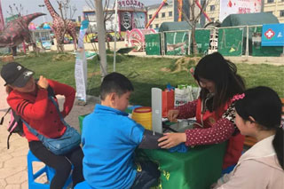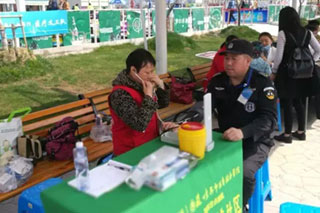 苏州东吴中西医结合医院义工队的医护人员一丝不苟的替来往的游客做检查,在乐园中玩累了、渴了的大人小孩,都可以到我们东吴义工队这里喝口水,歇一歇,顺便给自己的身体做个检查。