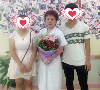 陆晓梅夫妻俩送花感谢徐久梅主任,并一起合影留念