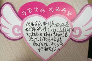 张妍告诉我们,那些天自己心情很不好,幸亏有老公的安慰和索主任的鼓励,自己才能坚持下来,才有了今天肚里的小baby。鲜花和卡片不能表达我所有的感谢,一切感谢尽在不言中。