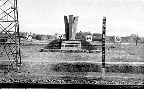 “柳条湖事件”是“九•一八”事变的导火索,也是日寇集结侵华的军事信号,发生地点被日本侵略者视作“风水宝地”加以“纪念”。图为1938年日寇为炫耀侵华罪行建成的所谓“柳条湖事件”标杆与爆破地点“纪念碑”。