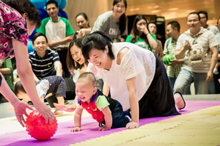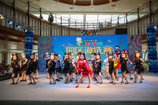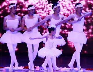 第七届东吴宝宝大赛现场,四个大男人陪着一个小女孩笨拙的跳着芭蕾舞