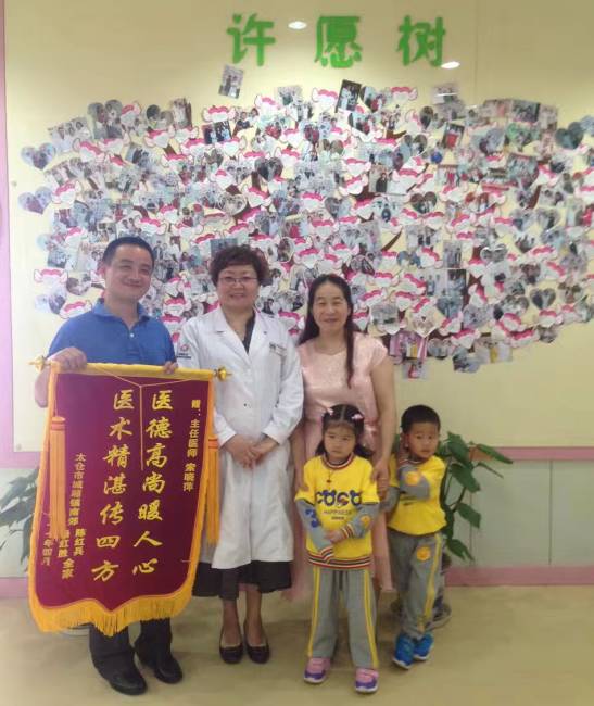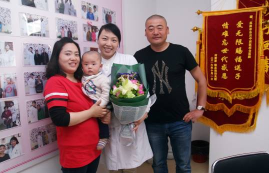这对夫妻,特别在2017年母亲节这天,带着锦旗和和五岁的龙凤胎孩子来看望当年给她治愈的索晓萍主任。这对夫妻婚后十余年不孕,38岁高龄时找到了索主任,一年后顺利怀上了两个健康的孩子,她说,他们一家人一辈子都会感恩索晓萍主任,给他们这么好的福报!